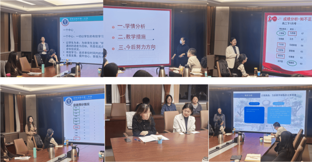 语文杨伟笑老师、数学郭晓娟老师、英语陈艳萍老师、地理周美芝老师、政治王佳宁老师、历史赵秀梅老师分别立足本学科,对当前的教学进度、学生的学习状态进行了深入分析,并提出了极具针对性的教学策略与个性化辅导方案。老师们的汇报既有宏观的学情把握,也有微观的因材施教,充分展现了教学工作的精细与深度。