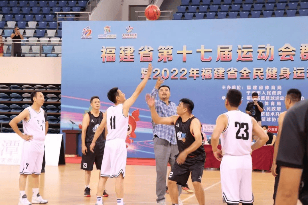 福建省第十七届运动会群众组篮球比赛暨2022年福建省全民健身运动会篮球总决赛在宁德市体育中心体育馆开幕。篮坛名宿、原八一队篮球运动员“战神”刘玉栋出席开幕式并为揭幕战抛球。