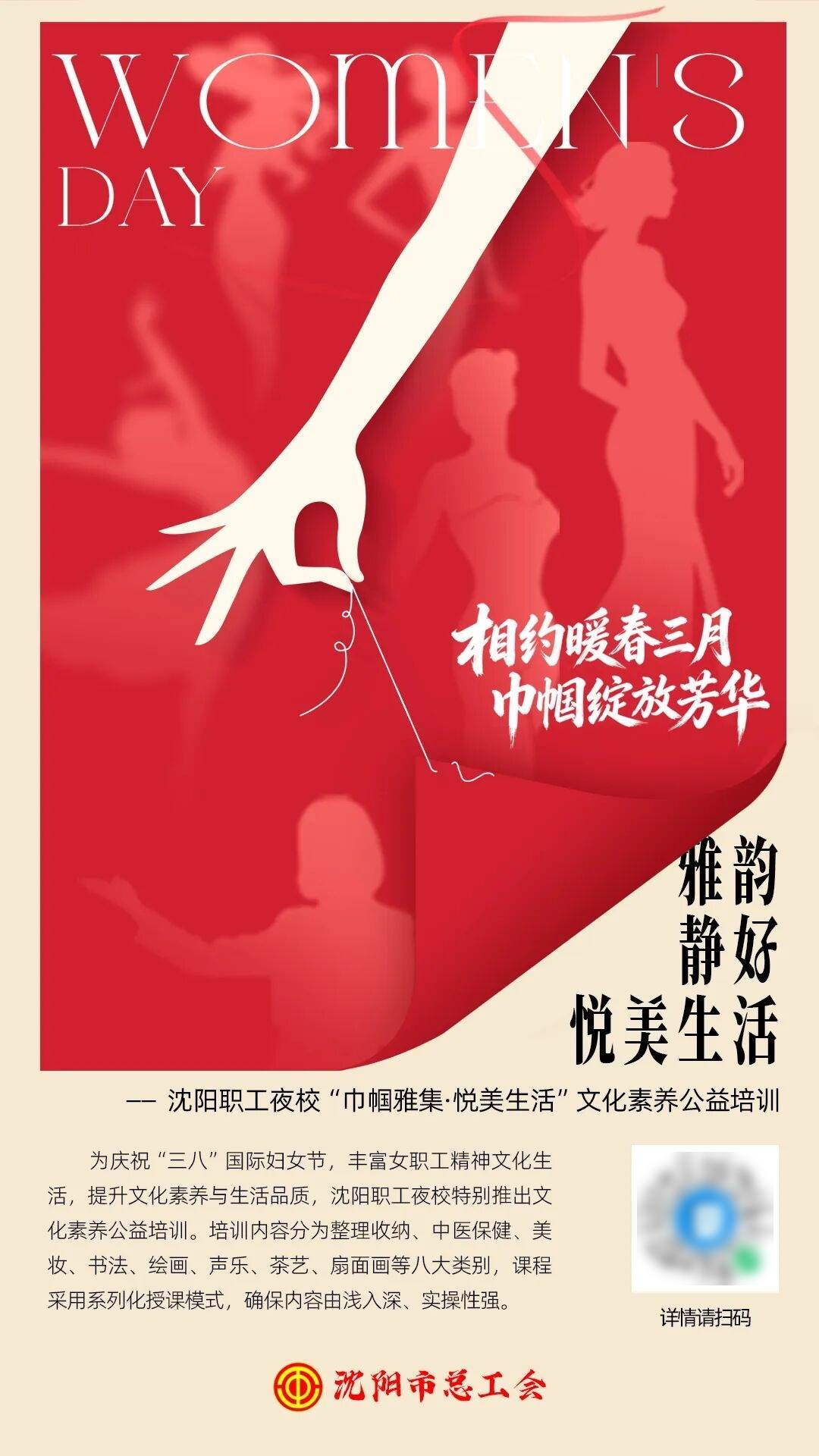 为庆祝“三八”国际妇女节,丰富女职工精神文化生活,提升文化素养与生活品质,沈阳职工夜校特别推出文化素养公益培训。培训内容分为整理收纳、中医保健、美妆、书法、绘画、声乐、茶艺、扇面画等八大类别,课程采用系列化授课模式,内容由浅入深、实操性强。