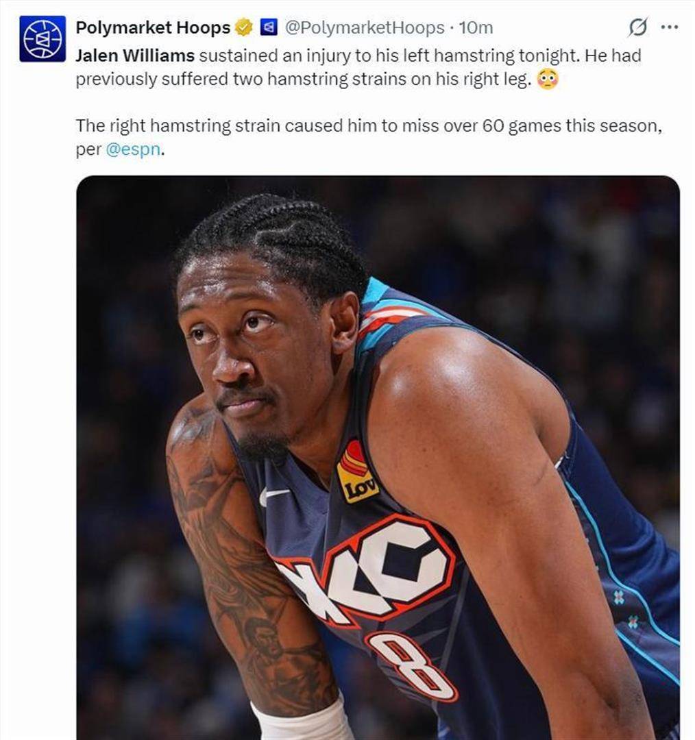 对于志在卫冕的雷霆而言,这无疑是一个充满矛盾的夜晚。 胜利巩固了他们的晋级优势,但伤病的幽灵再次降临,而且偏偏找上了他们最不愿看到的人。 杰伦-威廉姆斯,这位去年总决赛曾单场砍下40分的“大场面先生”,本赛季常规赛就因右腿筋伤势反复,足足缺席了49场比赛。