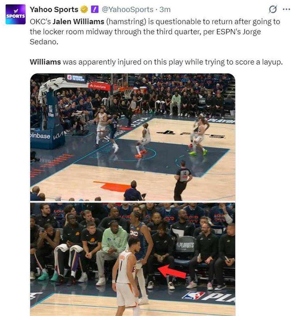 然而,这场看似顺利的胜利背后,却隐藏着让所有雷霆球迷心头一紧的阴霾。 球队二当家杰伦-威廉姆斯在第三节一次上篮后,捂着左大腿后侧径直走回了更衣室,再未回归。